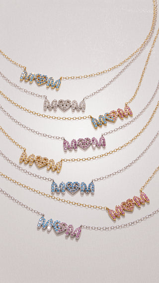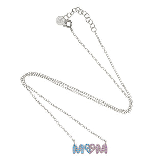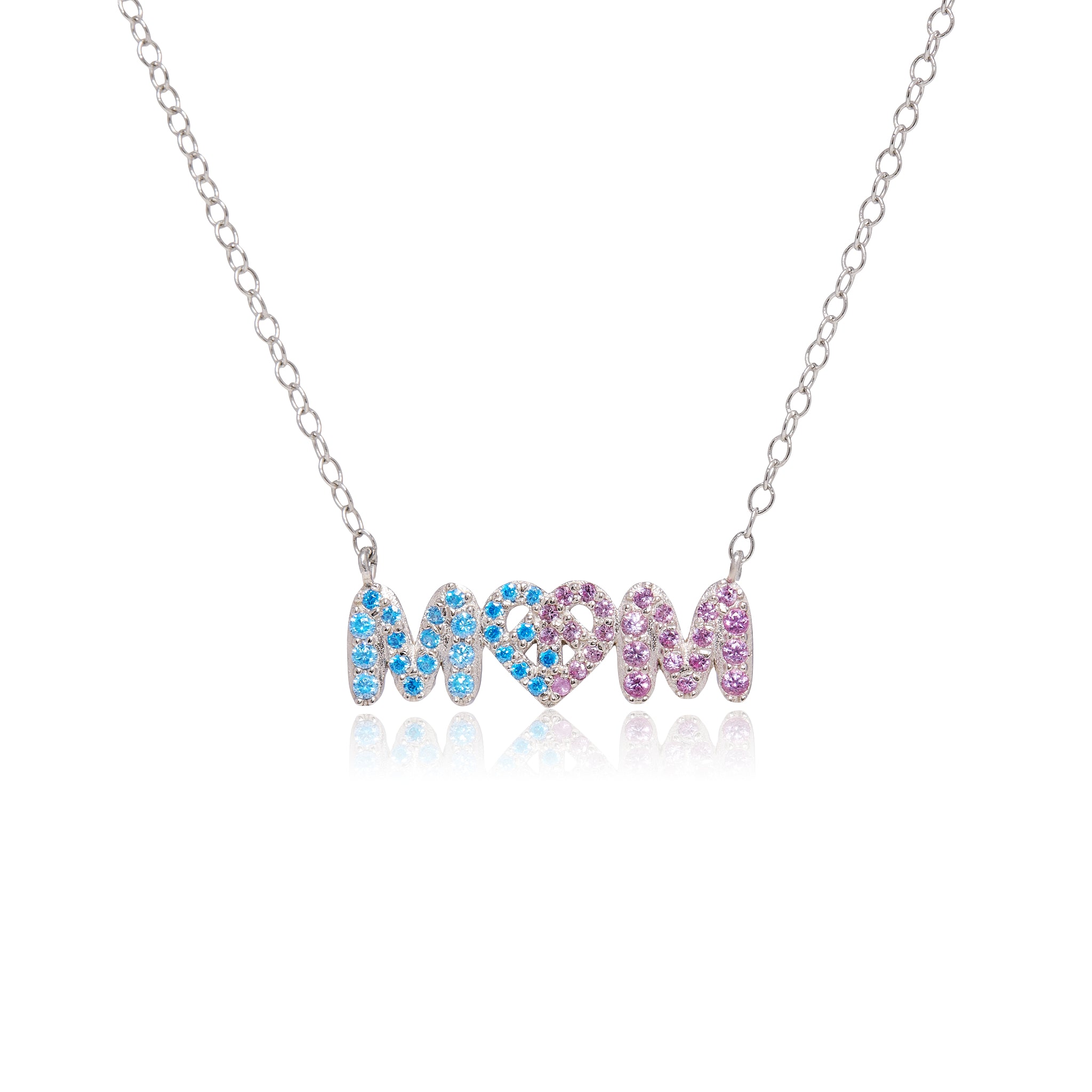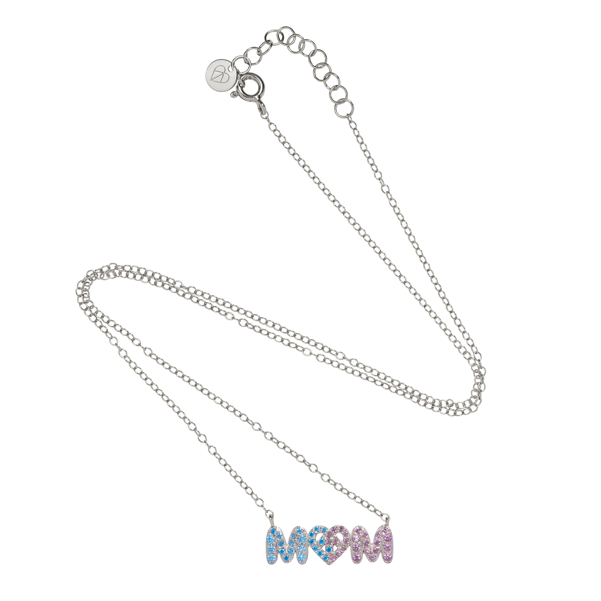 Shiny " MOM " necklace made of rhodium-plated 925 silver, decorated with aqua and pink zircon stones and the brand's distinctive heart in the middle. Because mom is the one who unites us and raises us in the same embrace.