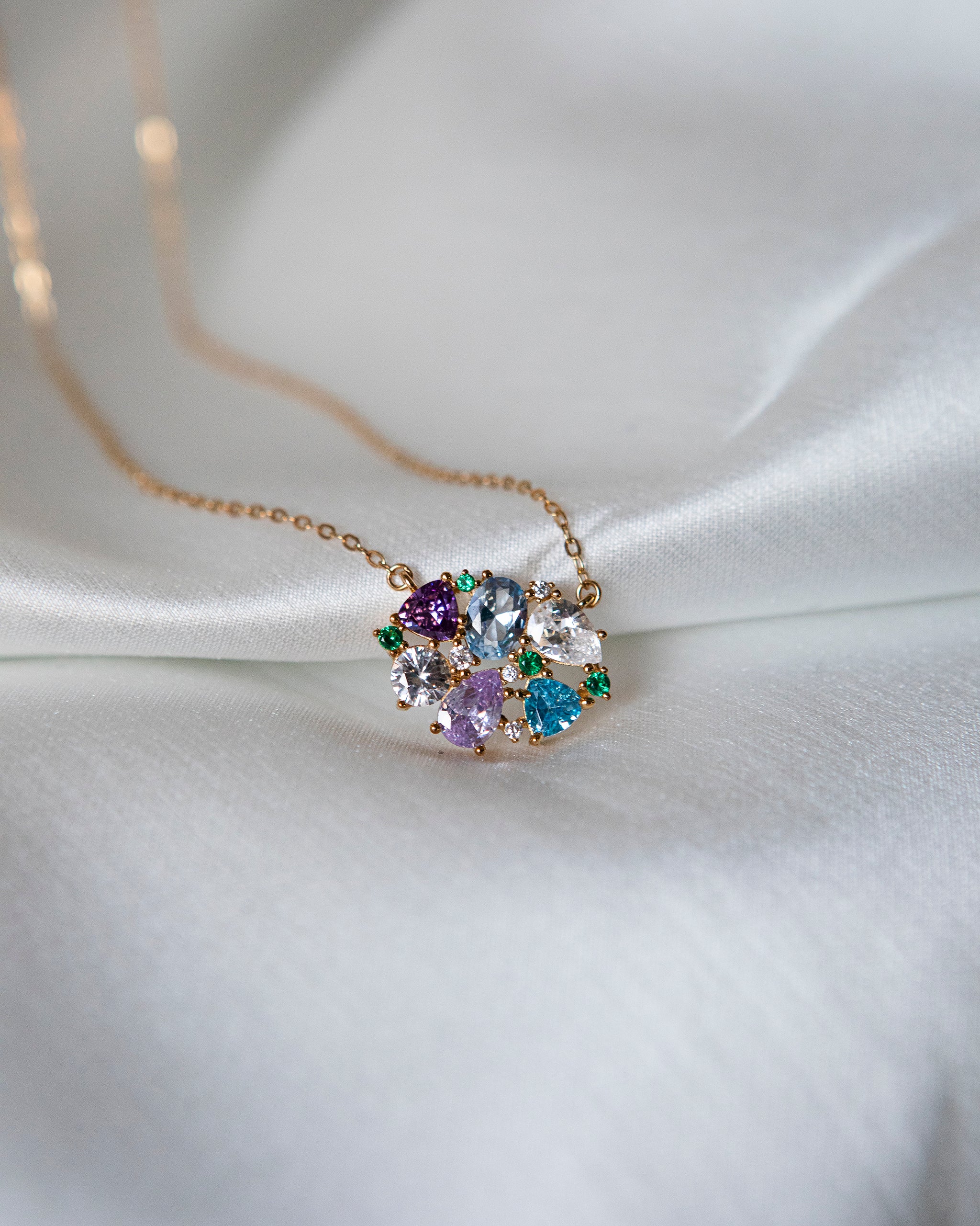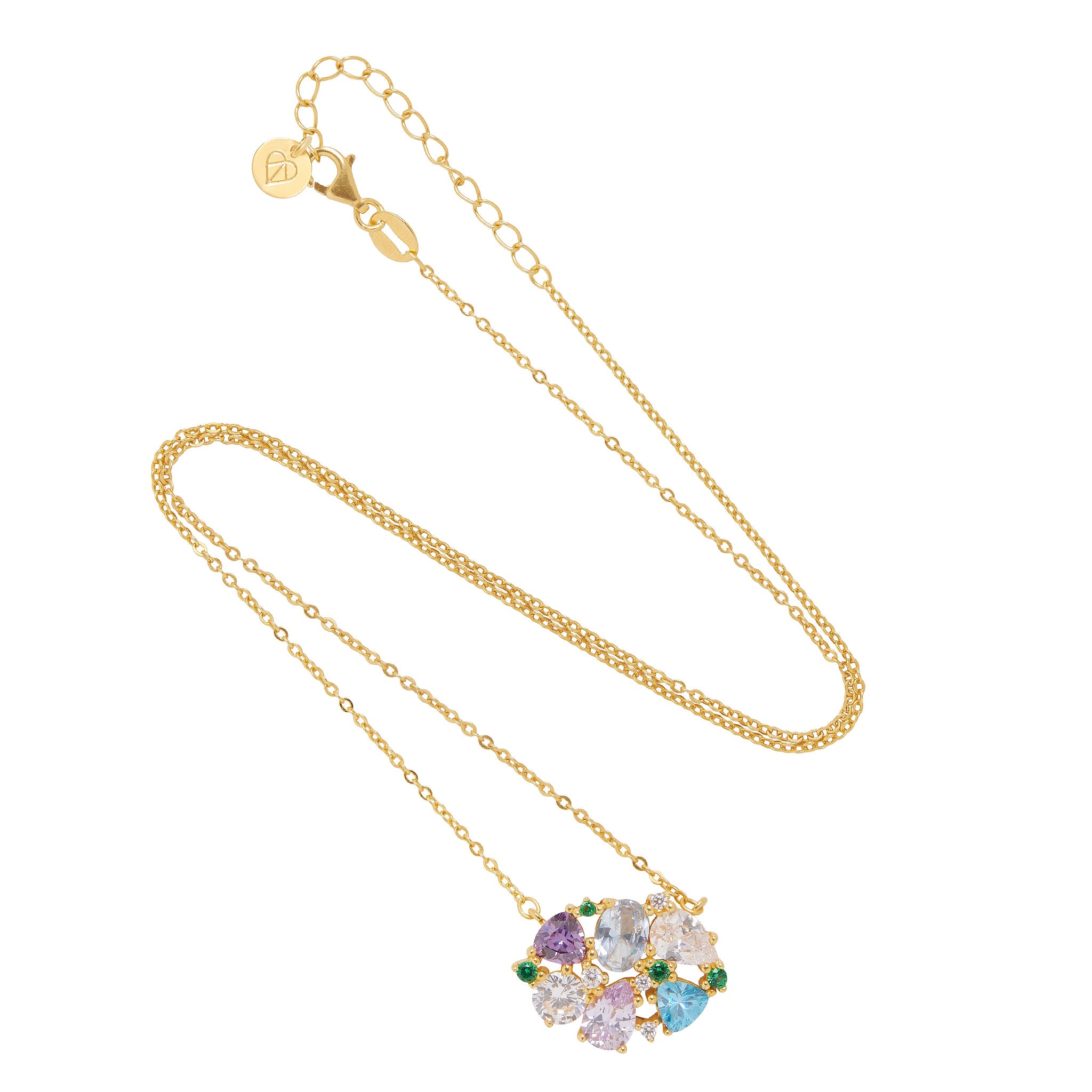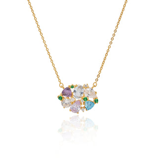 Golden necklace made of gold-plated (24 karats) 925 sterling silver, with sparkling zircon stones in various colors and shapes.
