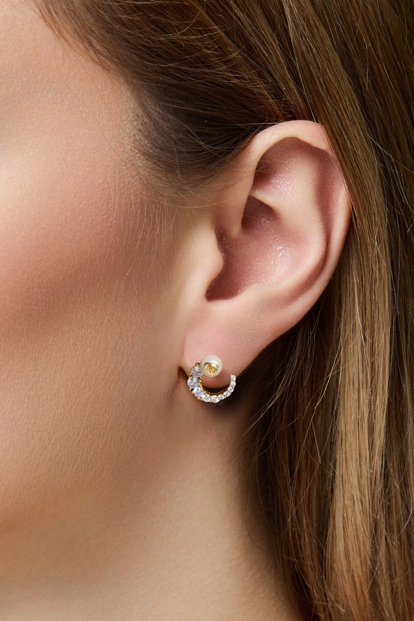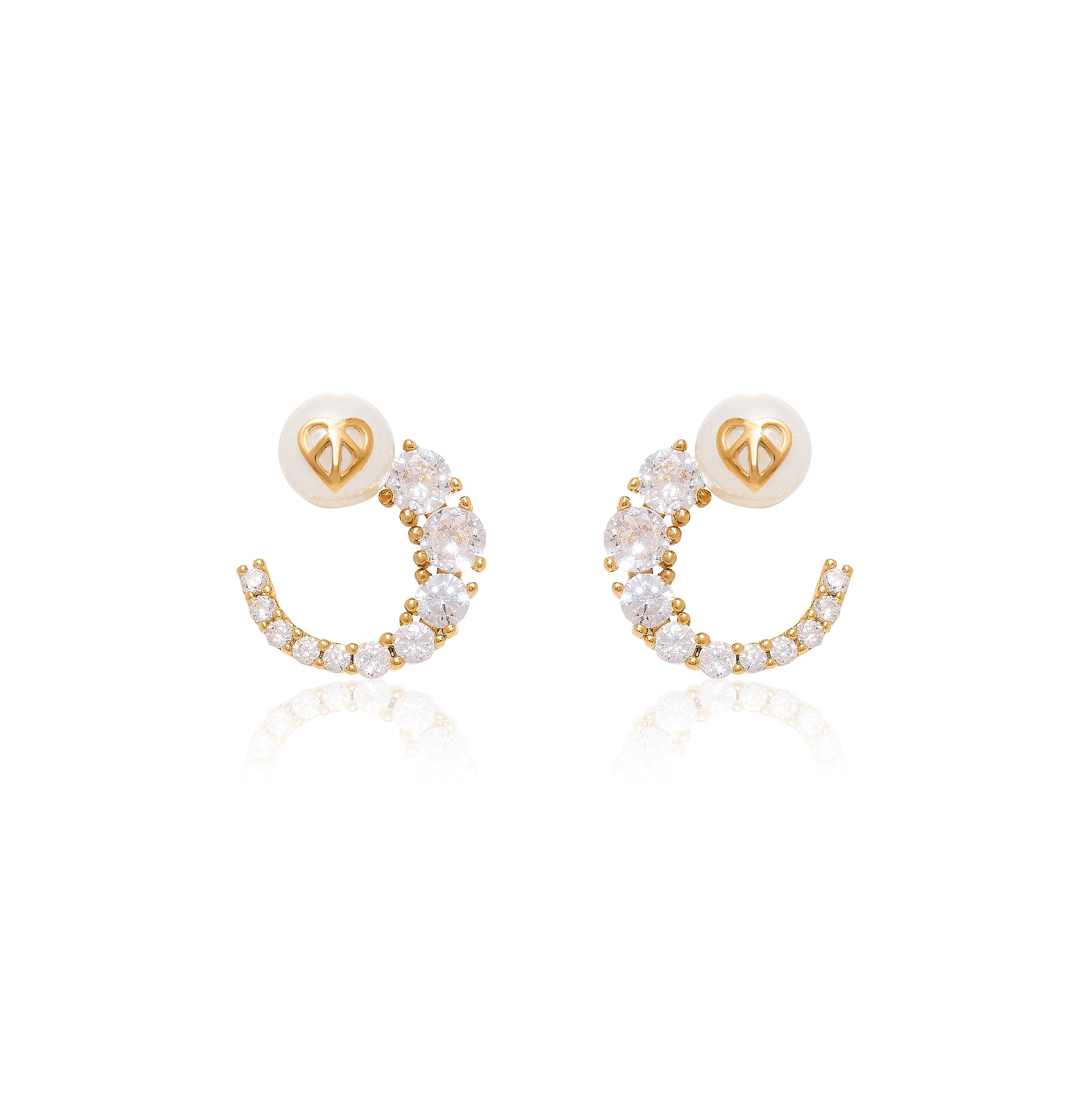 Earrings made of gold -plated 925 silver with white pearls , decorated with the brand's iconic heart-logo, and A semicircle of sparkling zircon stones that reflect light with every movement.