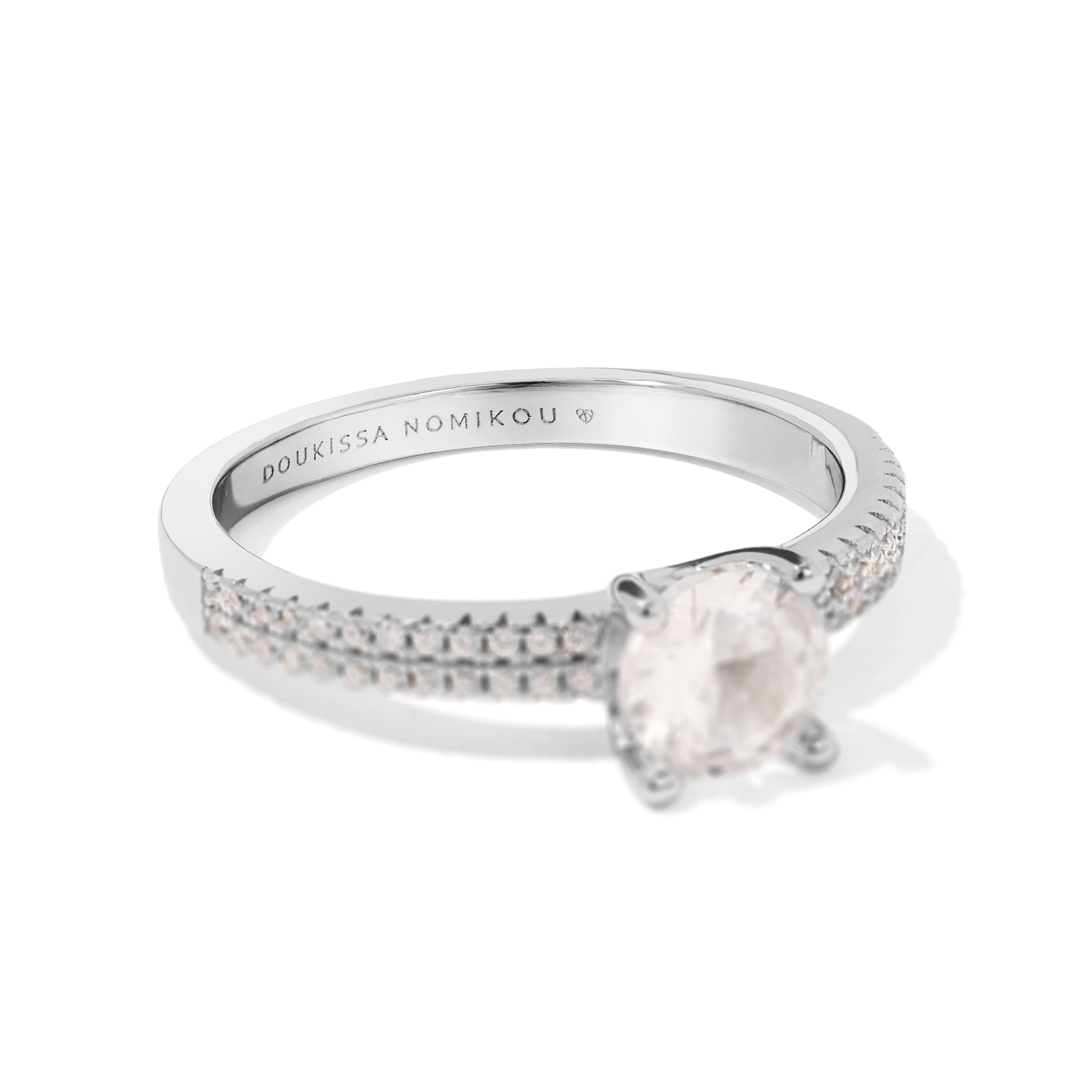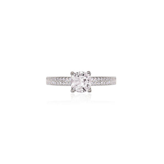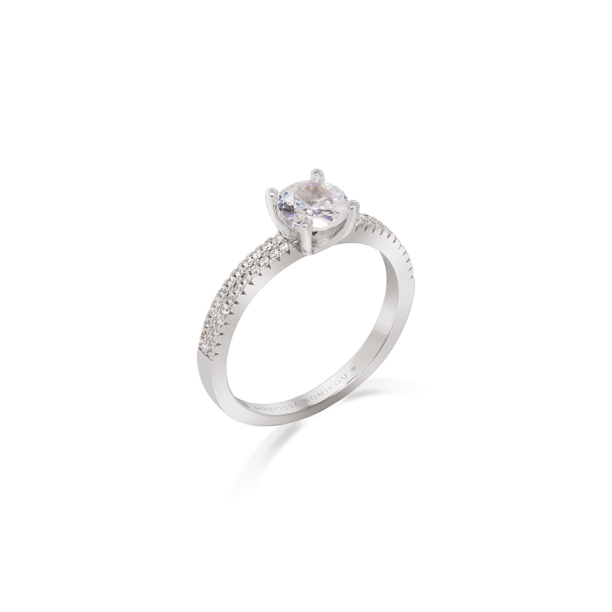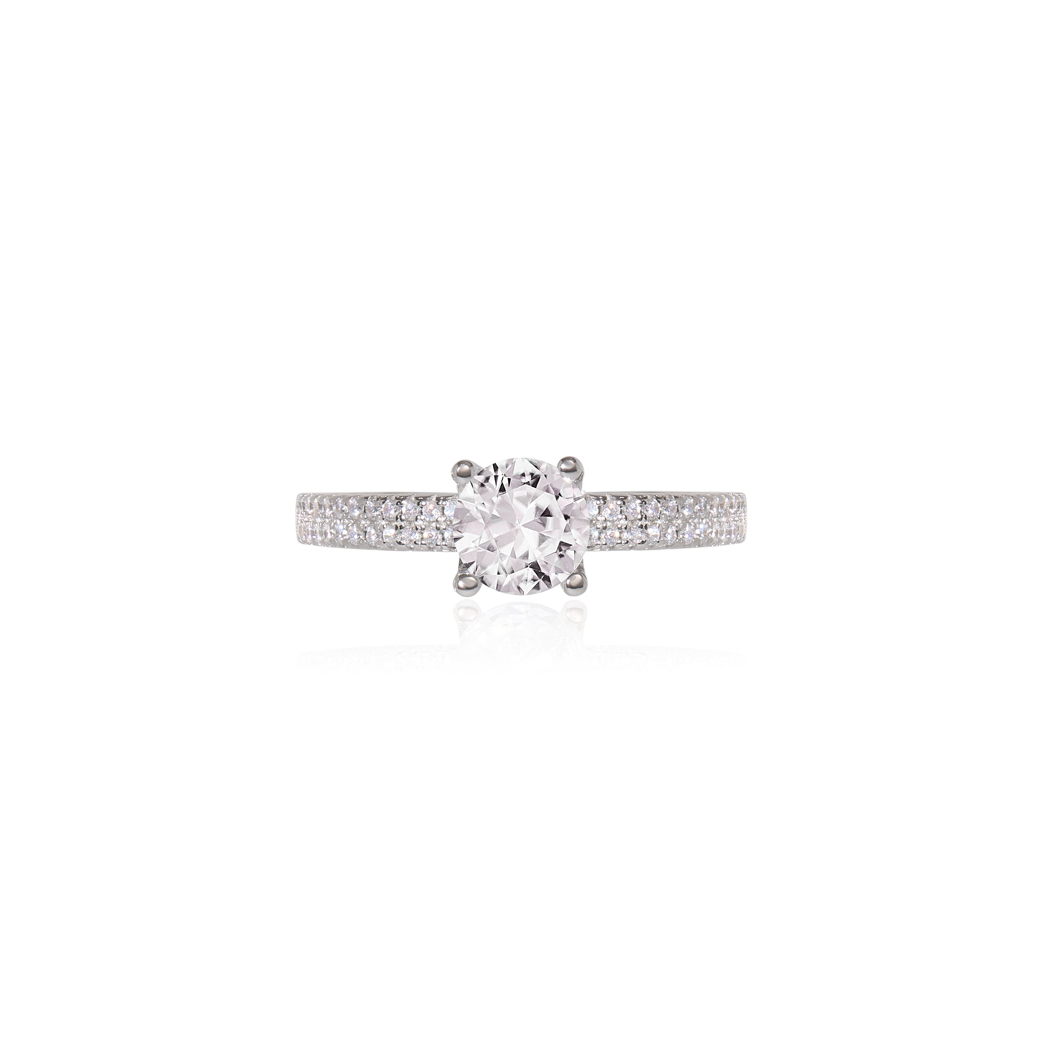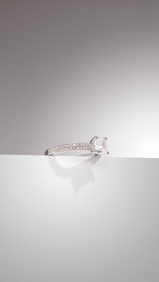Δαχτυλίδι μονόπετρο με μία μεγάλη λευκή πέτρα ζιργκόν, από επιροδιωμένο ασημί 925 και διπλή σειρά από λευκές πέτρες ζιργκόν στη γάμπα. Ιδανική επιλογή για γυναίκες που εντυπωσιάζουν τους πάντες στο πέρασμά τους!